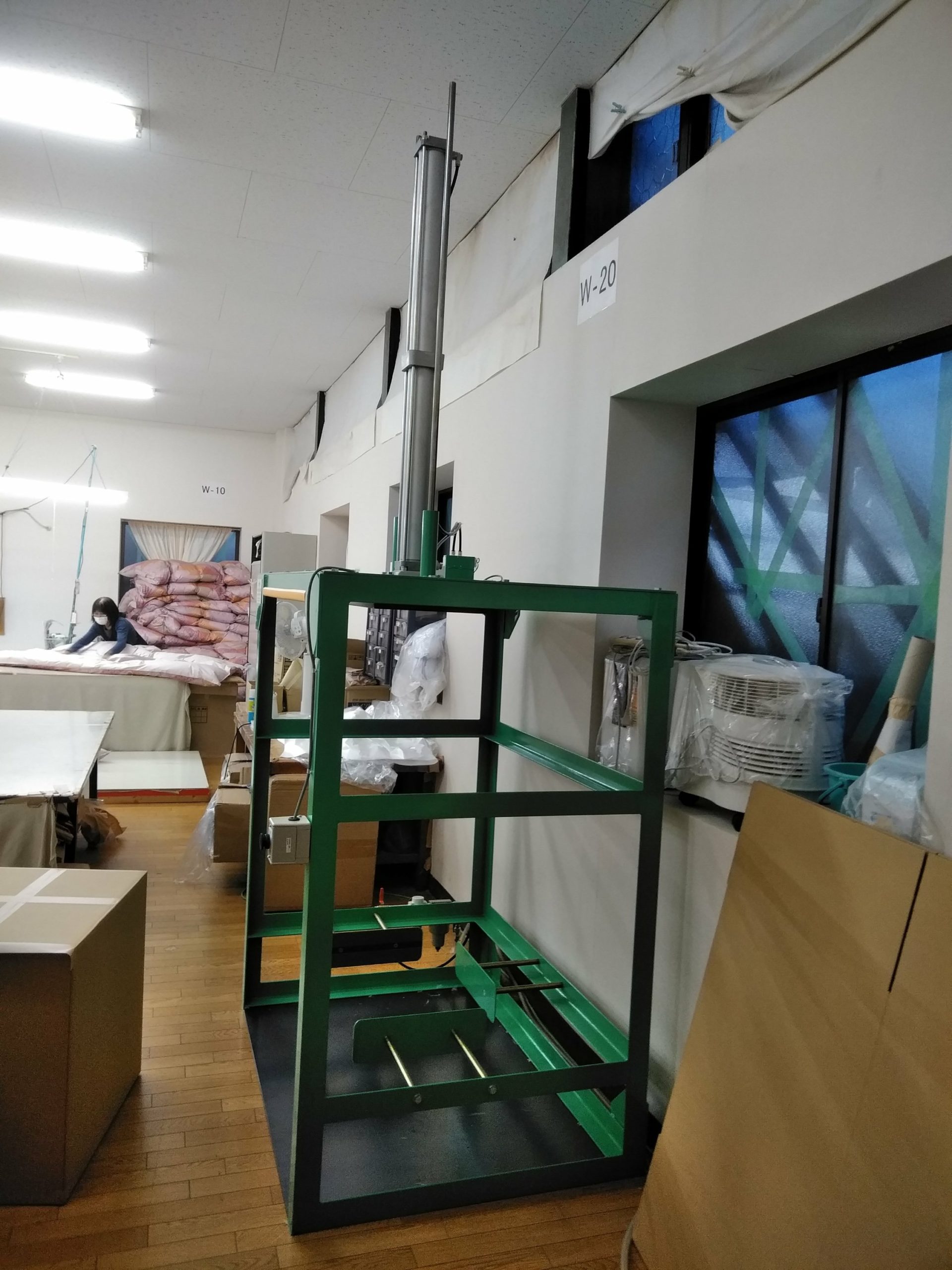 2019年12月24日 / 最終更新日時 : 2020年10月2日 Jumou ようこそJumouへ クリスマスイブに待ちに待った機械が届く ダンボールに布団を押し込む機械です。単純というか、単に押す機械なのですが、これを待っていました。運賃高騰の中、たくさんの布団を押し込む必要があり、人力でやっていました。 箱を固定して壊れにくくしてくれます。 消耗して何人か辞めてしまっていました。やっとできた機械。単純な機械だけど、救いの機械です。たくさん詰めるためよりも、キツイ作業を楽にしてくれるための機械。仲間を守るための機械。機械屋さんに感謝です。