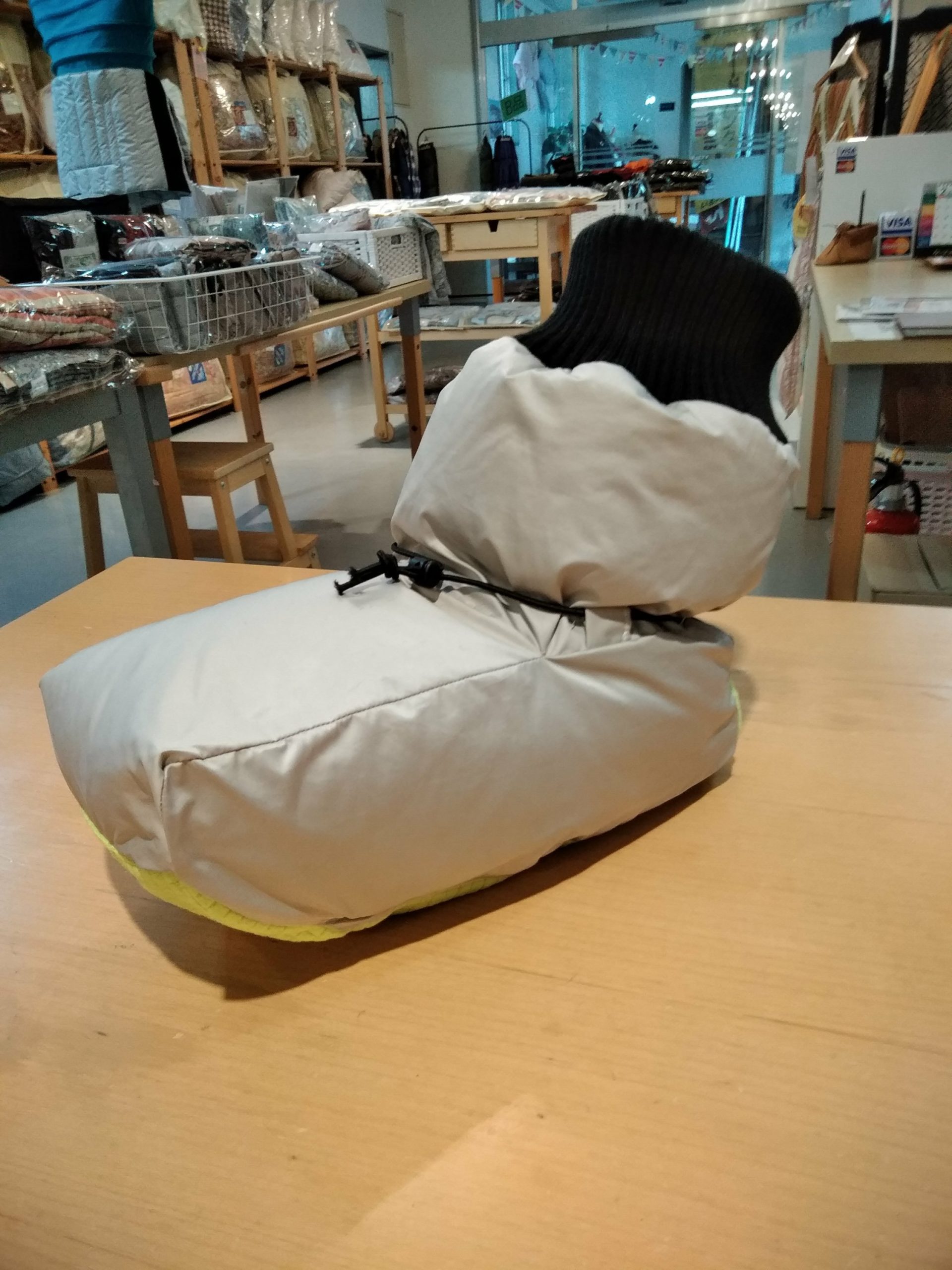 2020年2月28日 / 最終更新日時 : 2020年10月2日 Jumou スタッフブログ テントシューズ第三話 テントシューズ第三弾が完成しました。履き心地も良い感じになってきました。店長さんから「爪先がしまえる感じになるといいよね」というアドバイスをもらったので、ここから改良します。羽毛のポケットにつま先を突っ込む感じのイメージです。 ドローコードを足首に付けたのと底材を入れたからか、履き心地が良くなりました。 1つの形としてサンプル完成で良いかなと考えています。次は履き口もドローコードのものをもう一つ作ろうかと… ふくらはぎの位置にリブが来るので広がり過ぎかと思いました。履き口のところもドローコードにした方が良いように感じます。