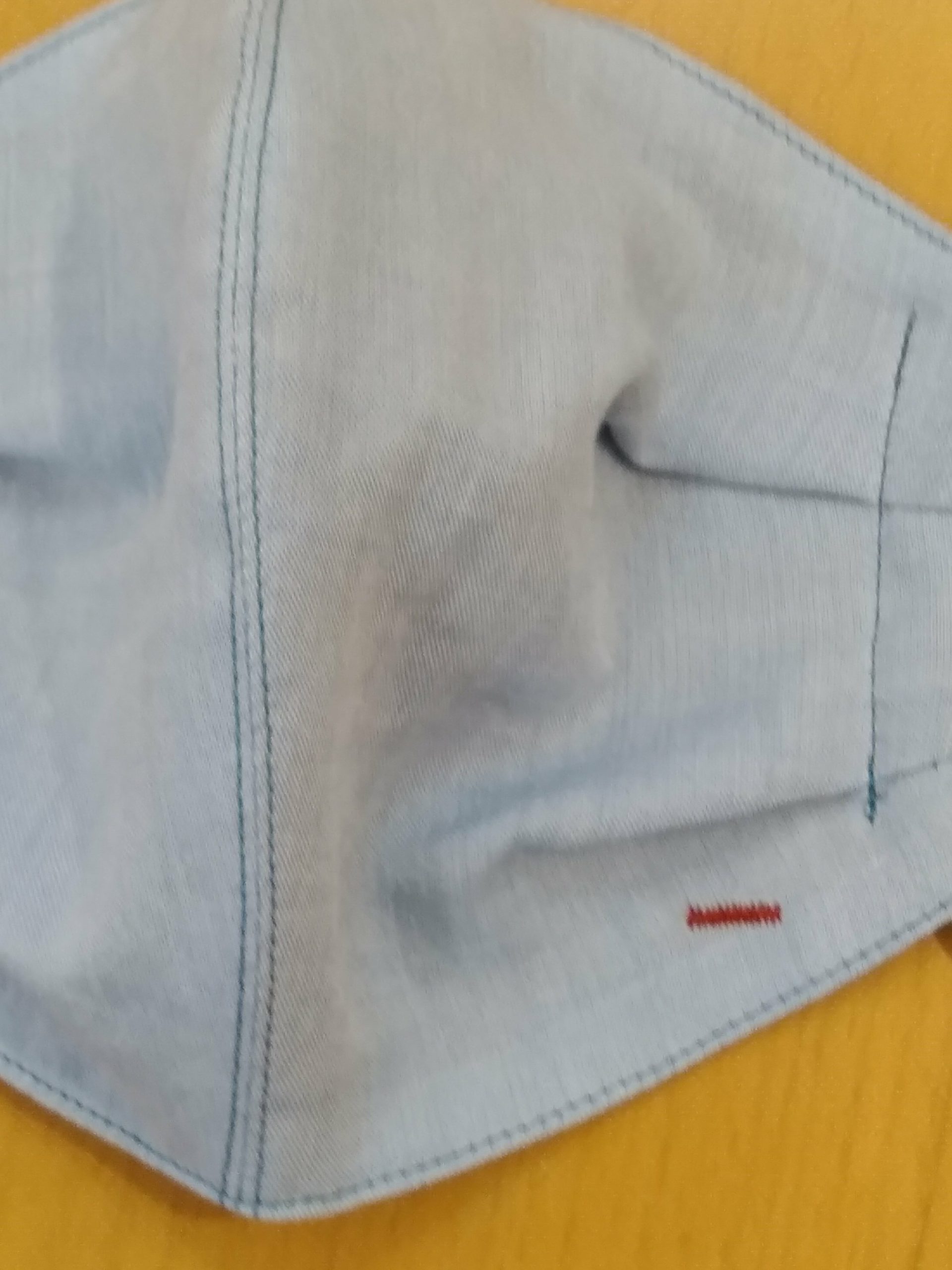 マスクの向かって右下に赤い糸でカンヌキを入れました。これが下です、という目印です。