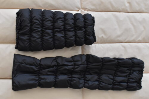 しかし、羽毛入りのレッグウォーマーの暖かさを知ってしまったお客さまからは、「膝上まで温めてくれるレッグウォーマーがほしい」と、ご要望は止まりません。