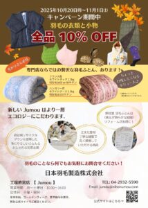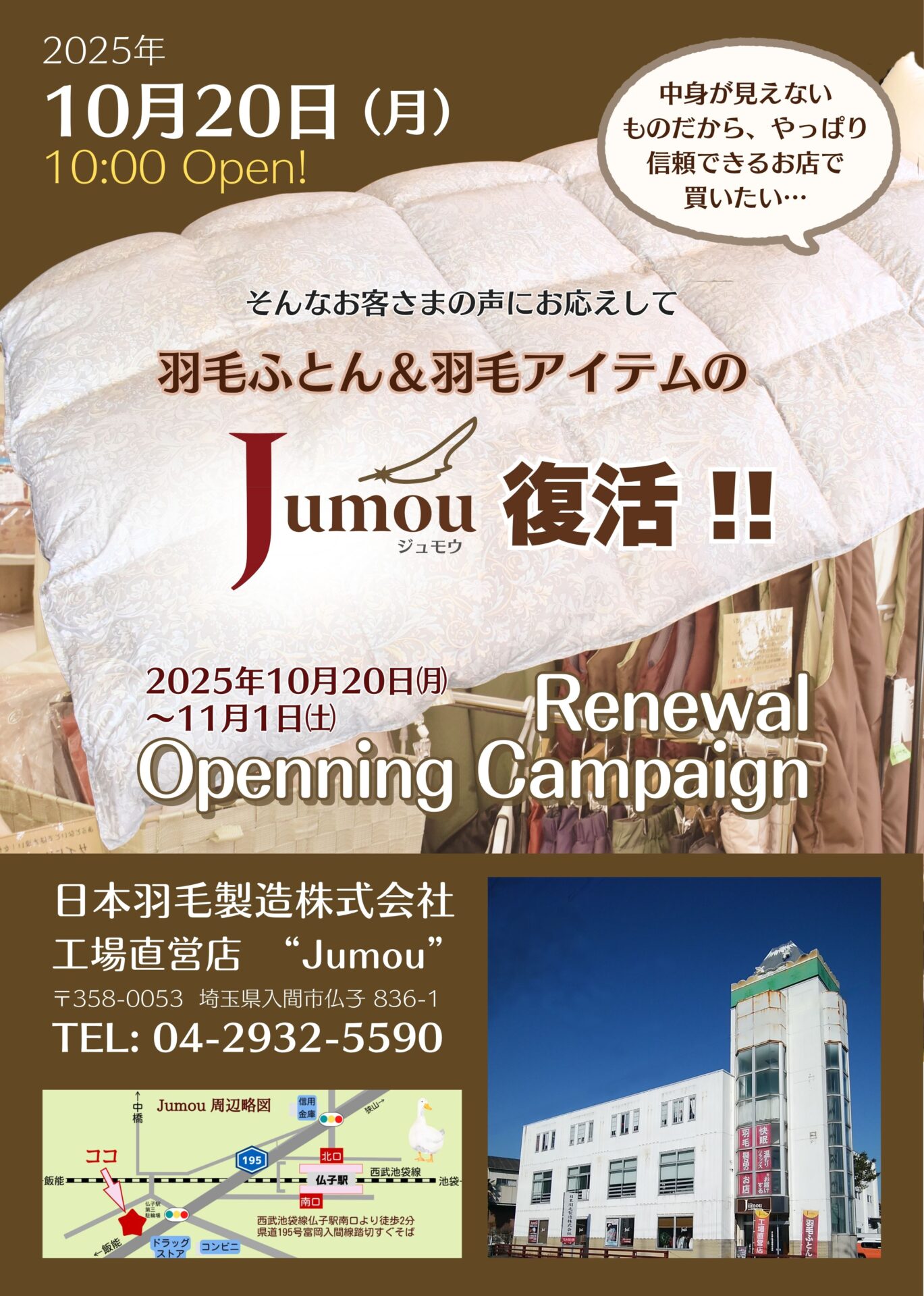 羽毛布団・羽毛アイテムの「Jumou(ジュモウ)」が復活します!|埼玉県入間市の羽毛ふとん工場直売店